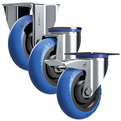 Standard duty zinc plated swivel braked castor fitted with a top plate and a blue EZRoll wheel.