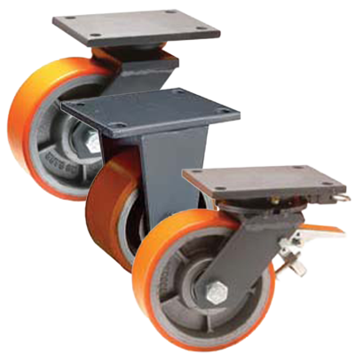 Fabricated swivel plate braked castor with polyurethane tyre and a cast iron core wheel.