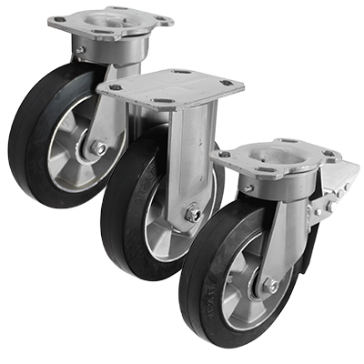 Fabricated swivel castor fitted with a top plate and a black elastic rubber tyre aluminium core wheel.