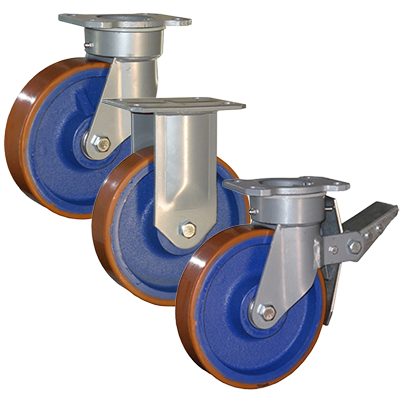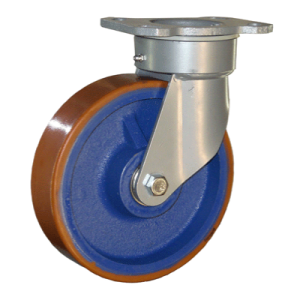 Fabricated swivel castor fitted with a top plate and a polyurethane tyre cast iron core wheel.