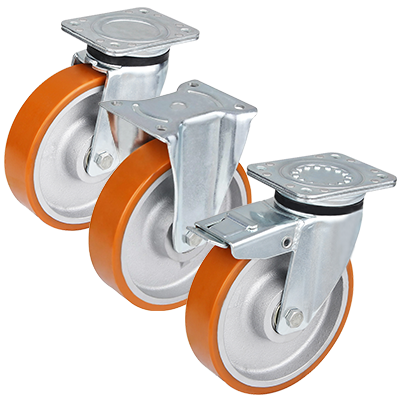 Heavy duty zinc plated swivel castor fitted with a top plate and a polyurethane tyre cast iron core wheel.