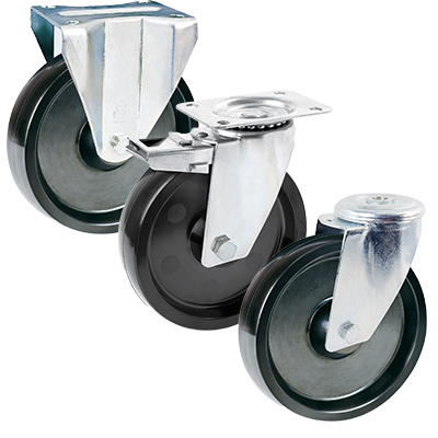 Our pressed steel castors with heat-resistant resin wheels maintain their rolling profile at continuous temperatures up to 120°C while supporting loads of 80-300kg per castor. These work reliably in bakery proofing areas, food production warm zones, and light industrial applications where ambient heat is consistent but not extreme. The resin wheels provide low rolling resistance and non-marking performance on epoxy-coated floors.