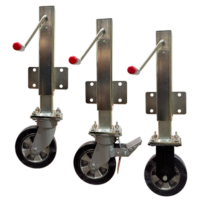 Fabricated swivel jacking castor fitted with a top plate and a black elastic rubber tyre aluminium core wheel.