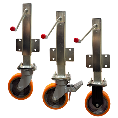 Fabricated swivel jacking castor fitted with a top plate and a polyurethane tyre nylon core wheel.