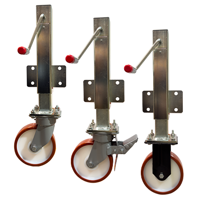 Fabricated swivel jacking castor fitted with a top plate and a polyurethane tyre nylon core wheel.