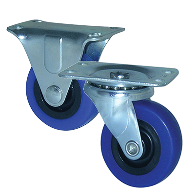 Low Level zinc plated swivel plate castor fitted with a blue elastic rubber wheel.