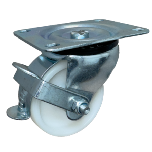 Low Level zinc plated fixed castor fitted with a nylon wheel.