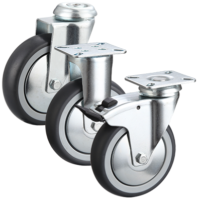 Light duty zinc plated fixed castor fitted with a plate and a grey rubber wheel.