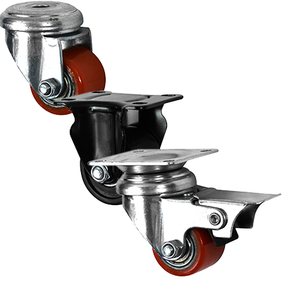 Low Level zinc plated swivel bolt hole castor fitted with a polyurethane tyre cast iron core wheel.
