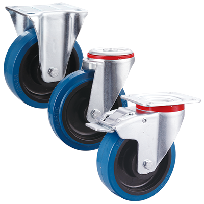 Standard duty zinc plated swivel braked castor fitted with a top plate and a blue elastic rubber wheel.