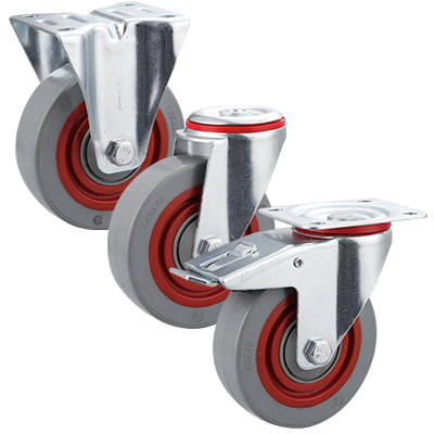 Standard duty zinc plated fixed castor fitted with a top plate and a noise reducing sandwich wheel.