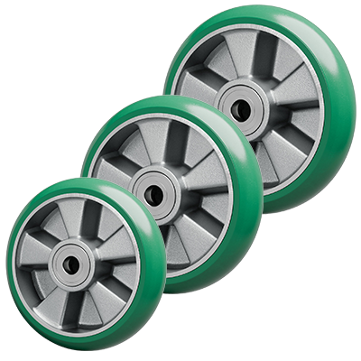 Polyurethane Tyred wheel with a convex R30 shape to improve maneuverability