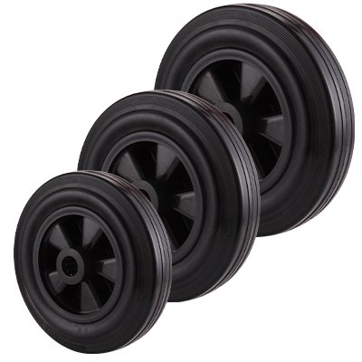 100mm wheel with blue elastic rubber tyre and black nylon core, plain bore. 180kg Load.