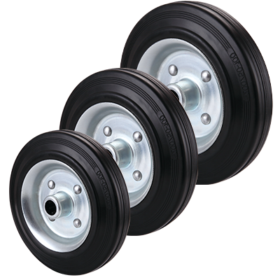 250mm wheel with black rubber tyre and a steel core with roller bearings. 295kg Load.